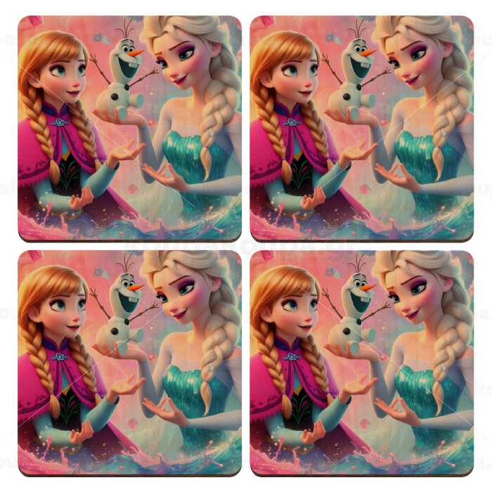 Elsa & Anna Princess, ΣΕΤ x4 Σουβέρ ξύλινα τετράγωνα plywood (9cm)