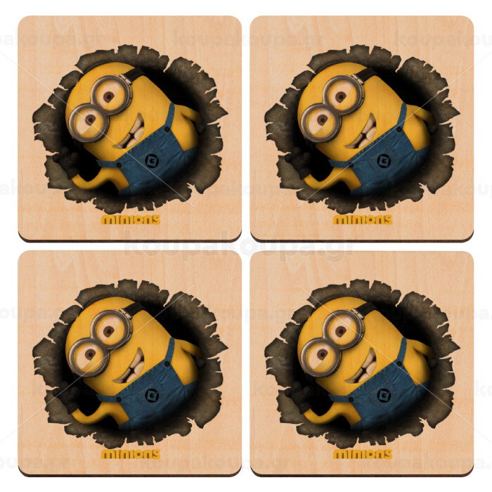 Minions hi, ΣΕΤ x4 Σουβέρ ξύλινα τετράγωνα plywood (9cm)