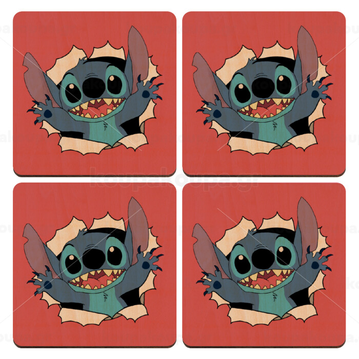 Stitch hello!!!, ΣΕΤ x4 Σουβέρ ξύλινα τετράγωνα plywood (9cm)