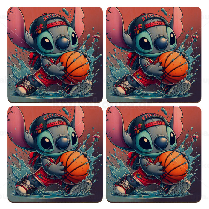 Stitch Basketball, ΣΕΤ x4 Σουβέρ ξύλινα τετράγωνα plywood (9cm)