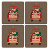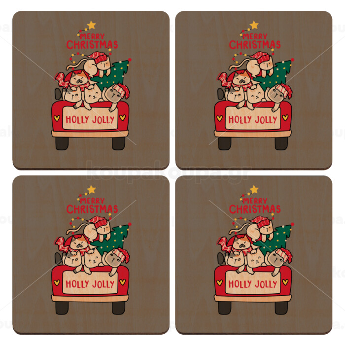 Merry Christmas cats in car, ΣΕΤ x4 Σουβέρ ξύλινα τετράγωνα plywood (9cm)