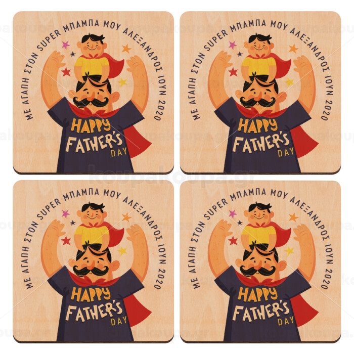 Happy Fathers Day με όνομα, ΣΕΤ x4 Σουβέρ ξύλινα τετράγωνα plywood (9cm)