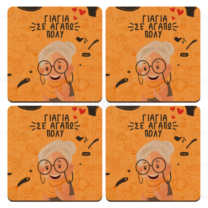 Γιαγιά σε αγαπώ πολύ!, ΣΕΤ x4 Σουβέρ ξύλινα τετράγωνα plywood (9cm)