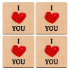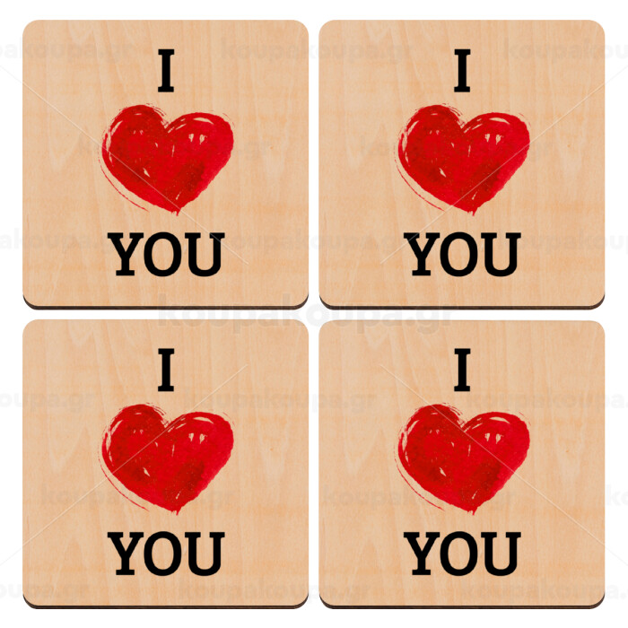I Love You, ΣΕΤ x4 Σουβέρ ξύλινα τετράγωνα plywood (9cm)
