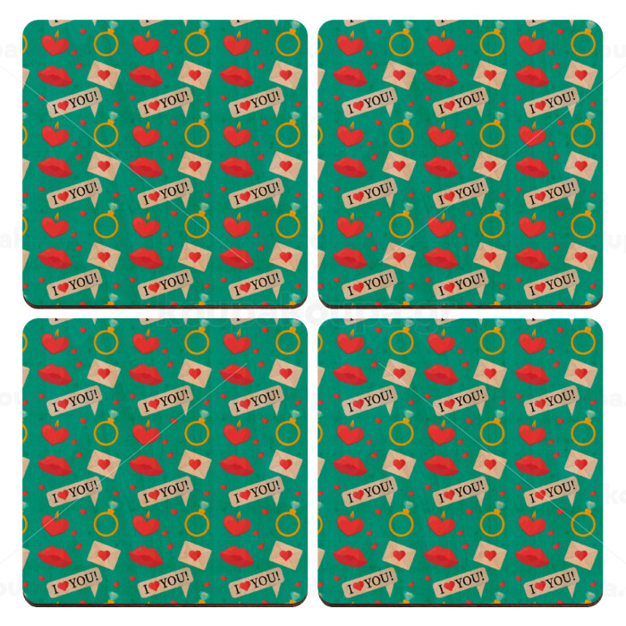 I Love You hearts rings & kiss pattern, ΣΕΤ x4 Σουβέρ ξύλινα τετράγωνα plywood (9cm)