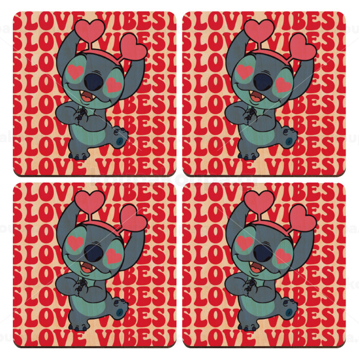 Lilo & Stitch Love vibes, ΣΕΤ x4 Σουβέρ ξύλινα τετράγωνα plywood (9cm)