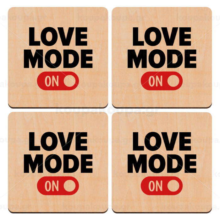 LOVE MODE ON, ΣΕΤ x4 Σουβέρ ξύλινα τετράγωνα plywood (9cm)
