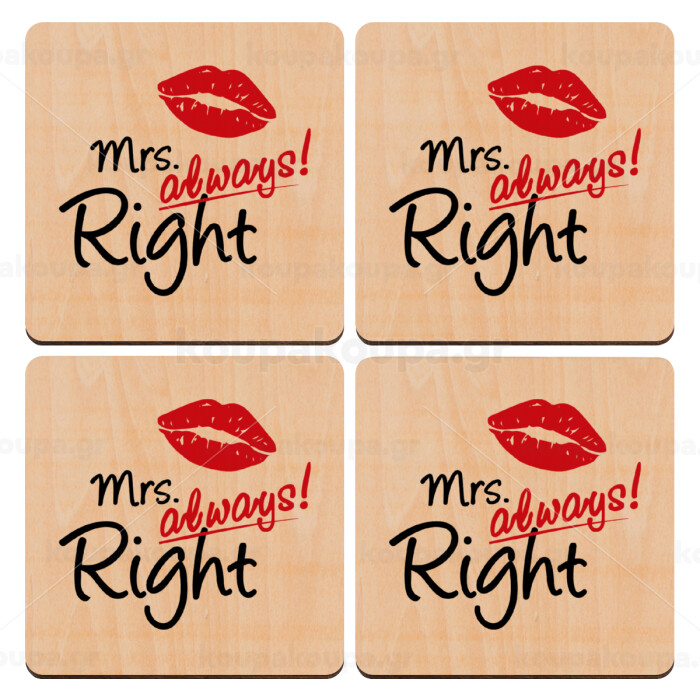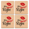 Mrs always right kiss, ΣΕΤ x4 Σουβέρ ξύλινα τετράγωνα plywood (9cm)