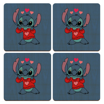 Stitch heart, ΣΕΤ x4 Σουβέρ ξύλινα τετράγωνα plywood (9cm)