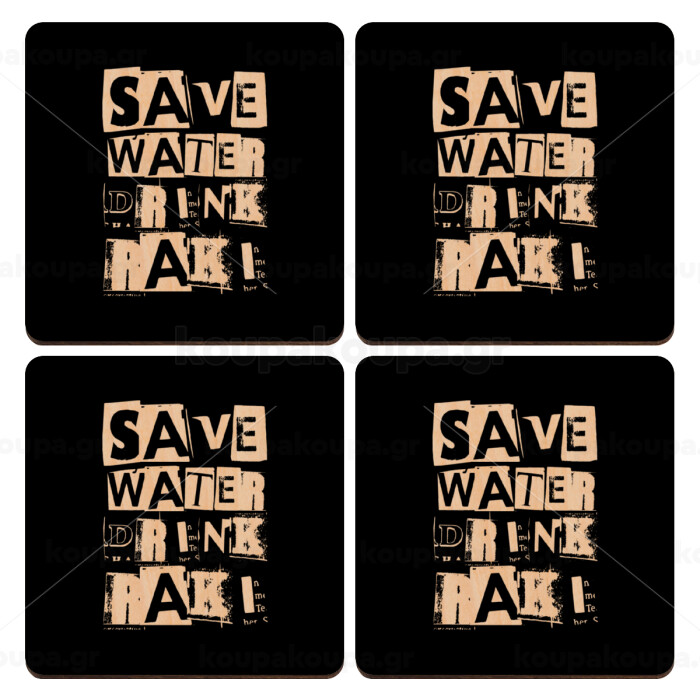 Save Water, Drink RAKI, ΣΕΤ x4 Σουβέρ ξύλινα τετράγωνα plywood (9cm)