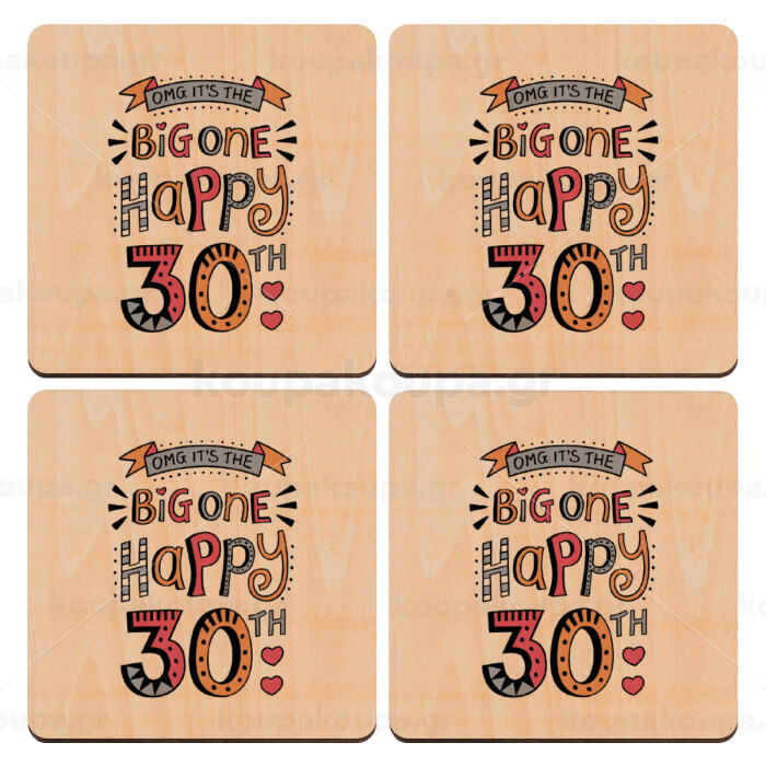 Big one Happy 30th, ΣΕΤ x4 Σουβέρ ξύλινα τετράγωνα plywood (9cm)