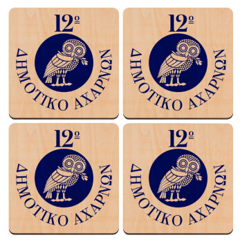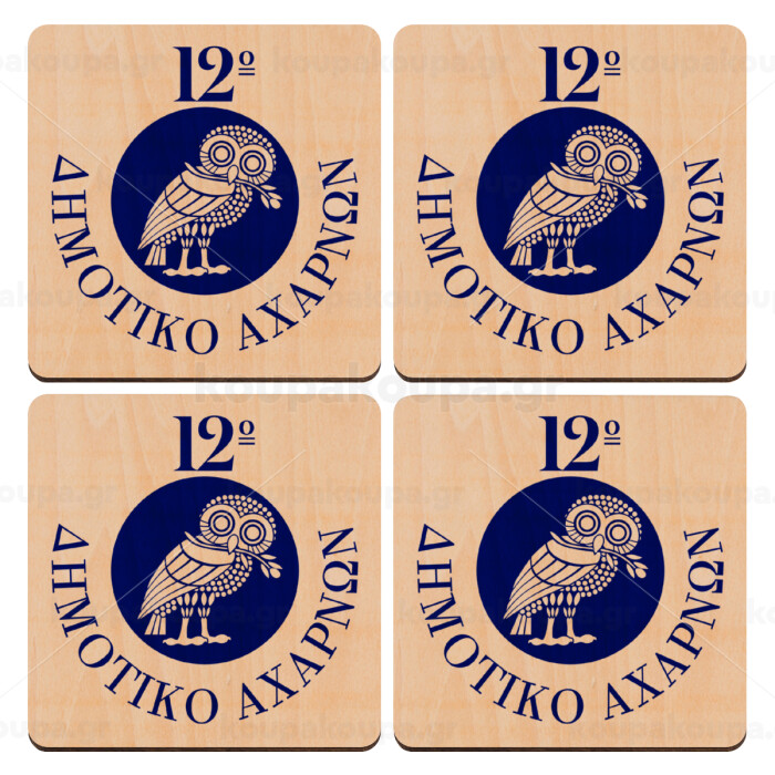Έμβλημα Σχολικό κουκουβάγια, ΣΕΤ x4 Σουβέρ ξύλινα τετράγωνα plywood (9cm)