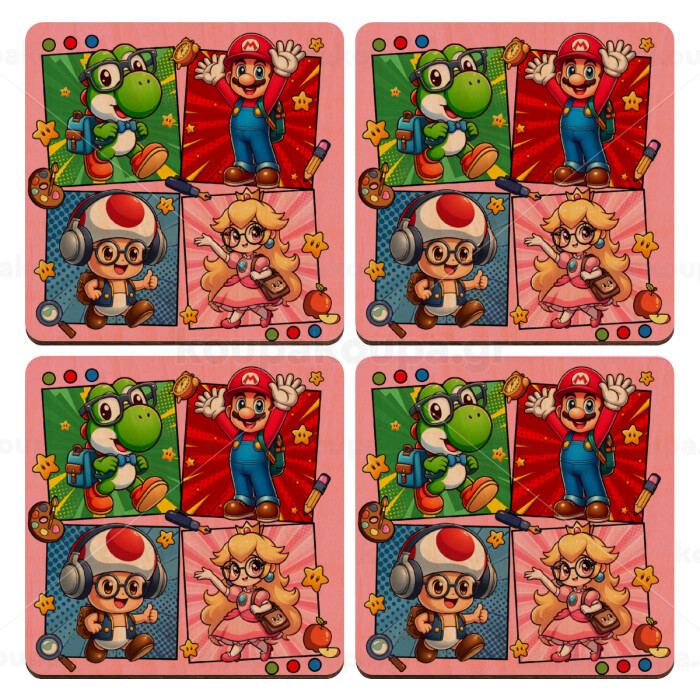 Back to the School Mario & Friends, ΣΕΤ x4 Σουβέρ ξύλινα τετράγωνα plywood (9cm)