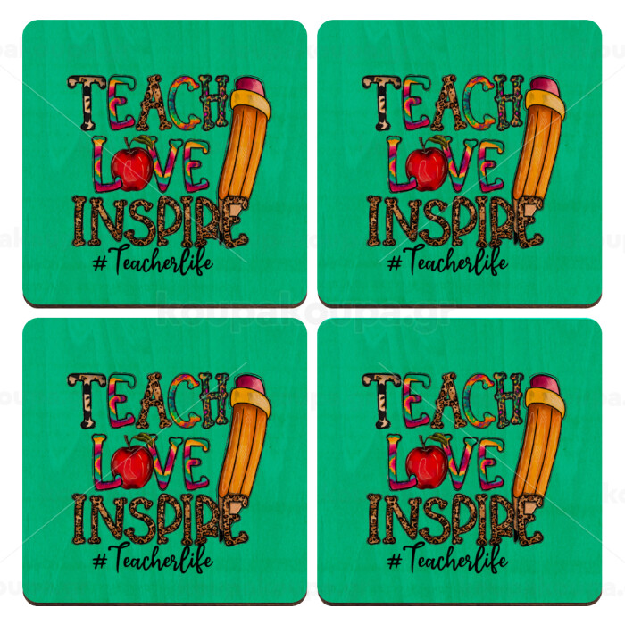 Teach, Love, Inspire, ΣΕΤ x4 Σουβέρ ξύλινα τετράγωνα plywood (9cm)
