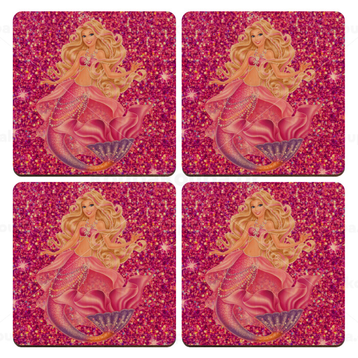 Barbie mermaid , ΣΕΤ x4 Σουβέρ ξύλινα τετράγωνα plywood (9cm)