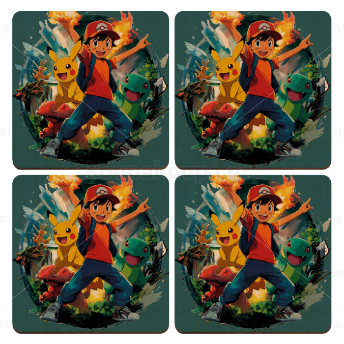 Ash Ketchum & Pikachu, ΣΕΤ x4 Σουβέρ ξύλινα τετράγωνα plywood (9cm)