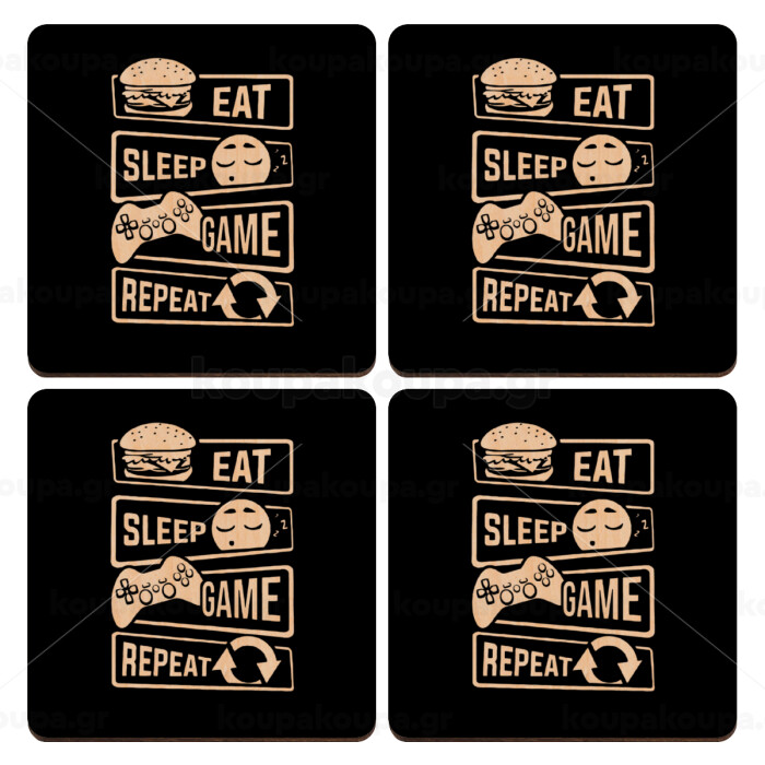 Eat Sleep Game Repeat, ΣΕΤ x4 Σουβέρ ξύλινα τετράγωνα plywood (9cm)