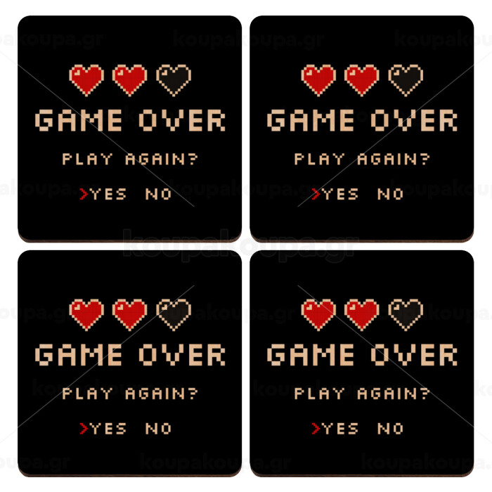 GAME OVER, Play again? YES - NO, ΣΕΤ x4 Σουβέρ ξύλινα τετράγωνα plywood (9cm)