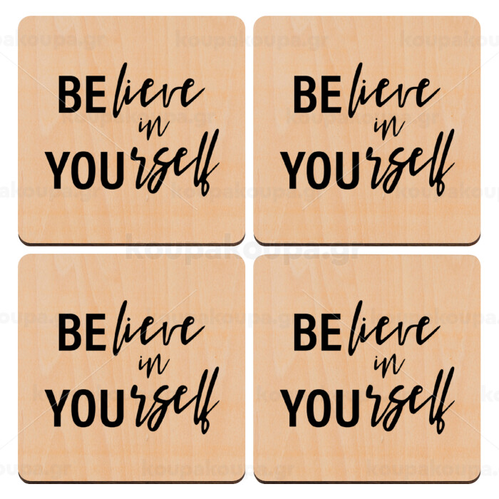 Believe in your self, ΣΕΤ x4 Σουβέρ ξύλινα τετράγωνα plywood (9cm)