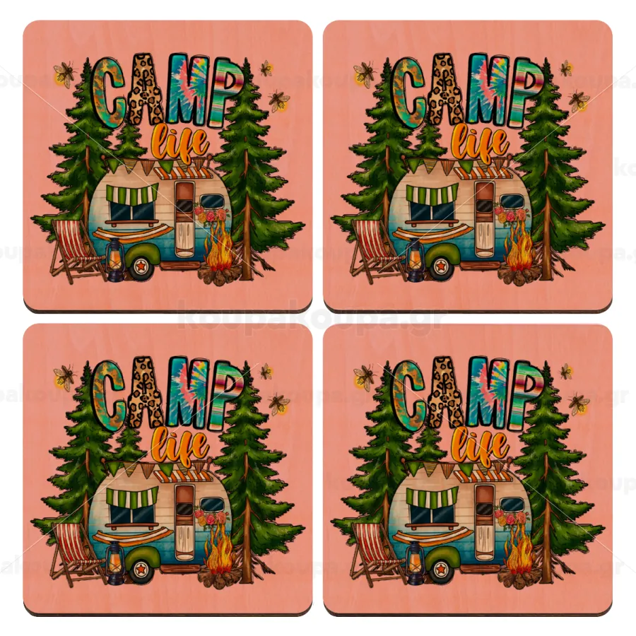 Camp Life, ΣΕΤ x4 Σουβέρ ξύλινα τετράγωνα plywood (9cm)