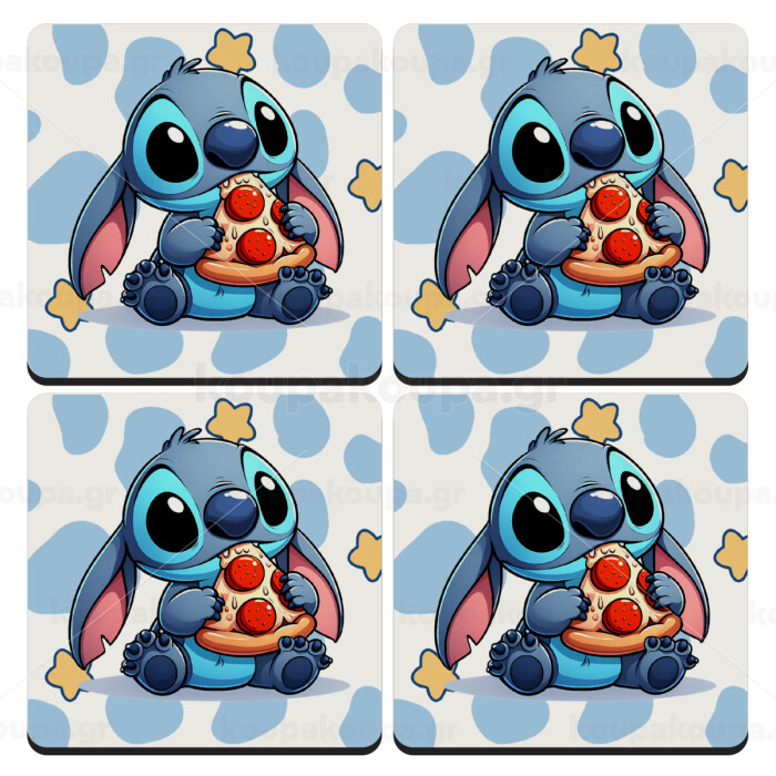 Stitch Pizza, ΣΕΤ 4 Σουβέρ ξύλινα τετράγωνα (9cm)