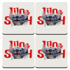 Glossy wooden (MDF) coasters, set of 4 pieces, tremendous durability in wet and hot dishes. Protects table surfaces.