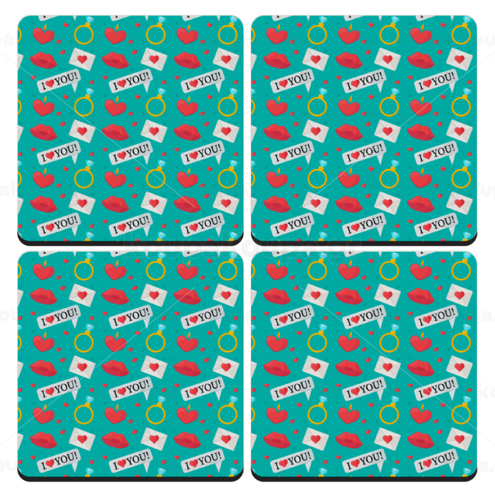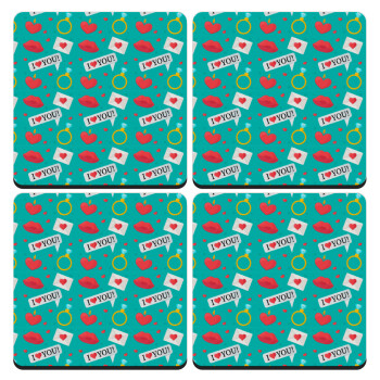 I Love You hearts rings & kiss pattern, ΣΕΤ 4 Σουβέρ ξύλινα τετράγωνα (9cm)