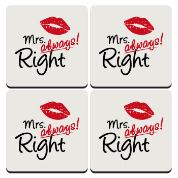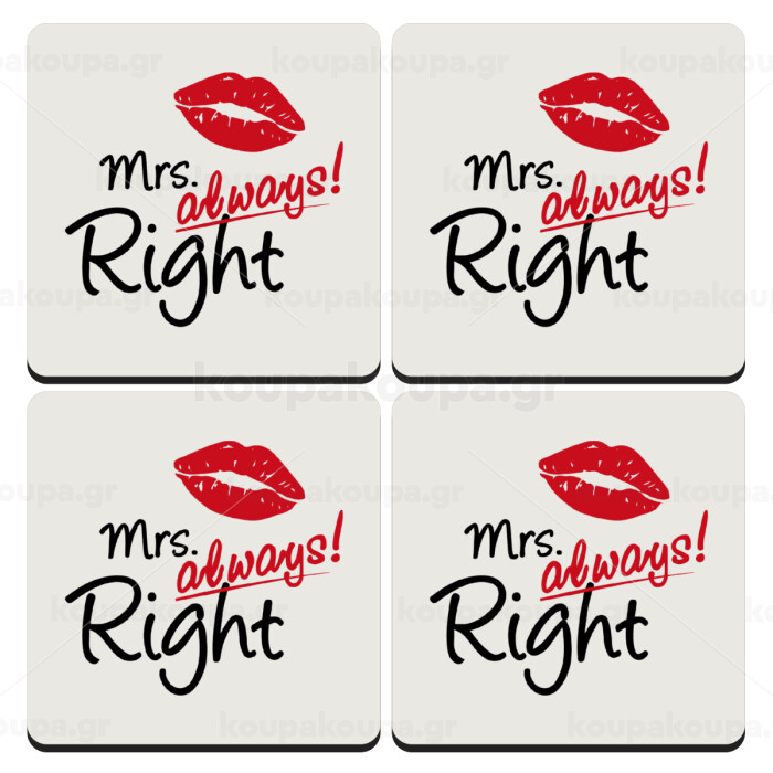 Mrs always right kiss, ΣΕΤ 4 Σουβέρ ξύλινα τετράγωνα (9cm)