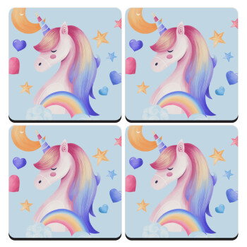 Cute unicorn, ΣΕΤ 4 Σουβέρ ξύλινα τετράγωνα (9cm)