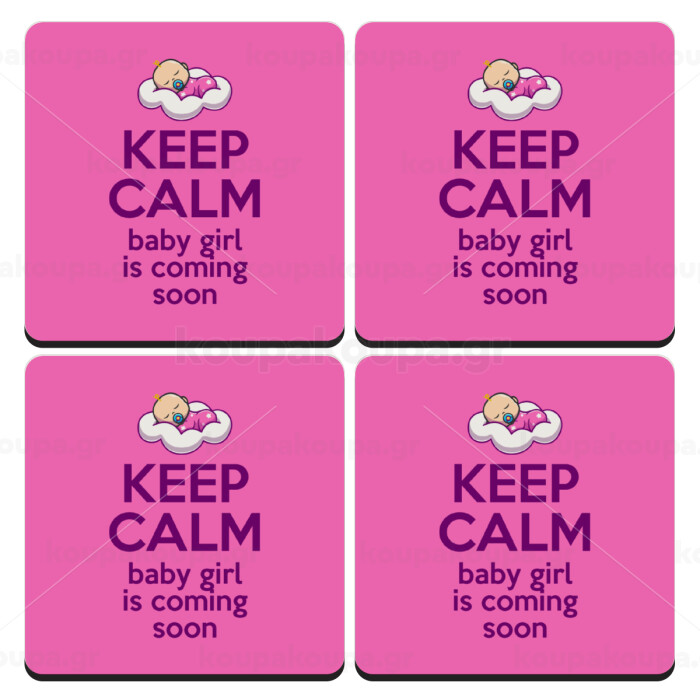 KEEP CALM baby girl is coming soon!!!, ΣΕΤ 4 Σουβέρ ξύλινα τετράγωνα (9cm)