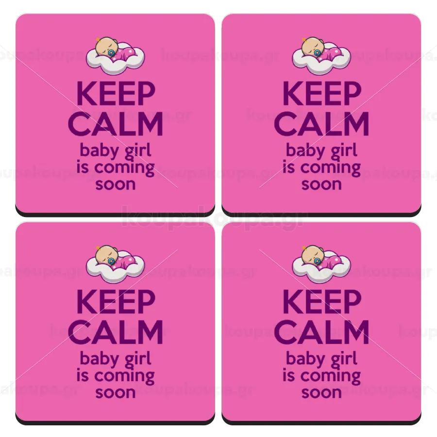 KEEP CALM baby girl is coming soon!!!, ΣΕΤ 4 Σουβέρ ξύλινα τετράγωνα (9cm)