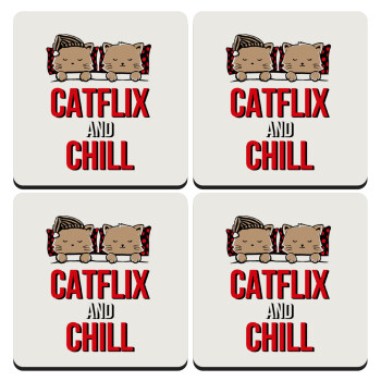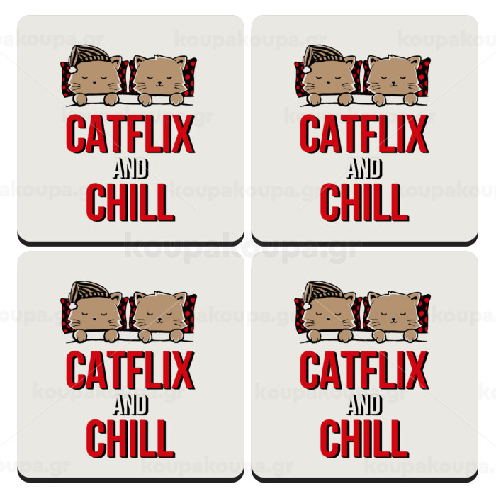 Catflix and Chill, ΣΕΤ 4 Σουβέρ ξύλινα τετράγωνα (9cm)