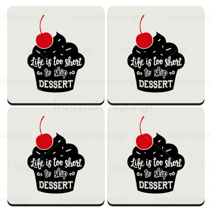 Life is too short, to skip Dessert, ΣΕΤ 4 Σουβέρ ξύλινα τετράγωνα (9cm)