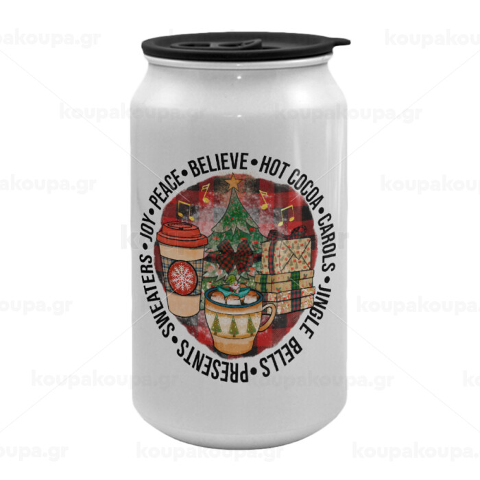 Joy, Peace, Believe, Hot Cocoa, Carols, Κούπα ταξιδιού μεταλλική με καπάκι (tin-can) 500ml