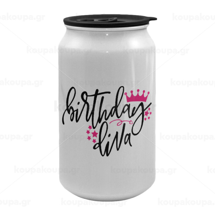 Birthday Diva queen, Κούπα ταξιδιού μεταλλική με καπάκι (tin-can) 500ml