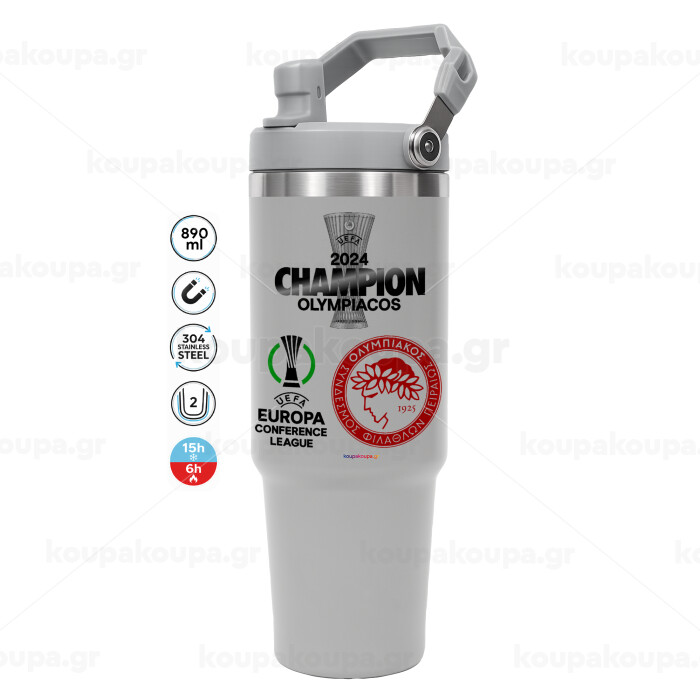 Olympiacos UEFA Europa Conference League Champion 2024, GREY color, 890ml (30oz) stainless Steel Tumbler with Handle