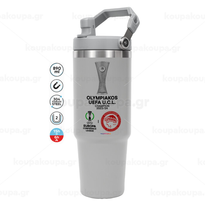 Olympiacos UEFA Europa Conference League Champion 2023/24, GREY color, 890ml (30oz) stainless Steel Tumbler with Handle