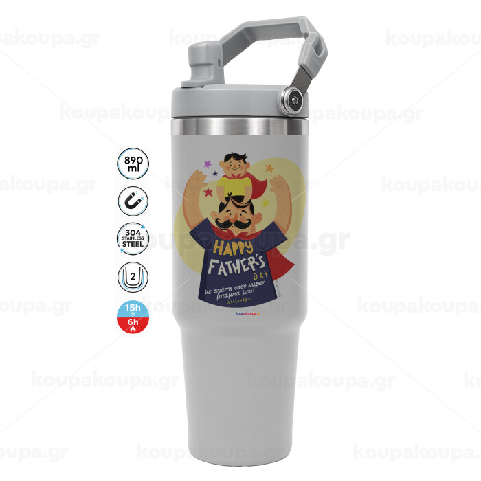 Happy Fathers Day με όνομα, GREY color, 890ml (30oz) stainless Steel Tumbler with Handle