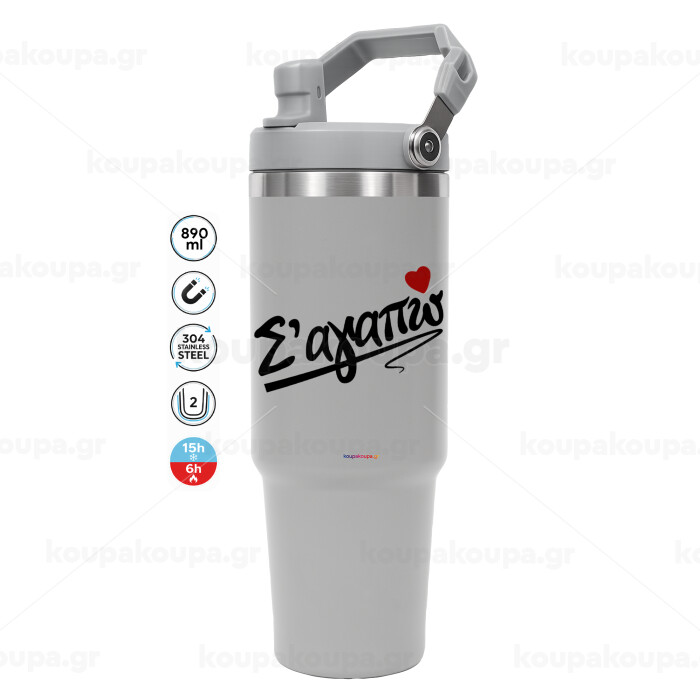 Σ΄ αγαπώ!!!, GREY color, 890ml (30oz) stainless Steel Tumbler with Handle