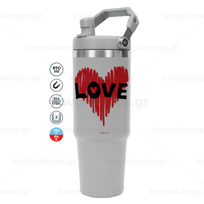 I Love You red heart, GREY color, 890ml (30oz) stainless Steel Tumbler with Handle