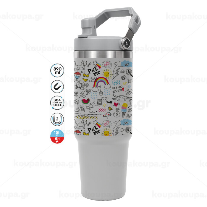 Doodle kids, GREY color, 890ml (30oz) stainless Steel Tumbler with Handle