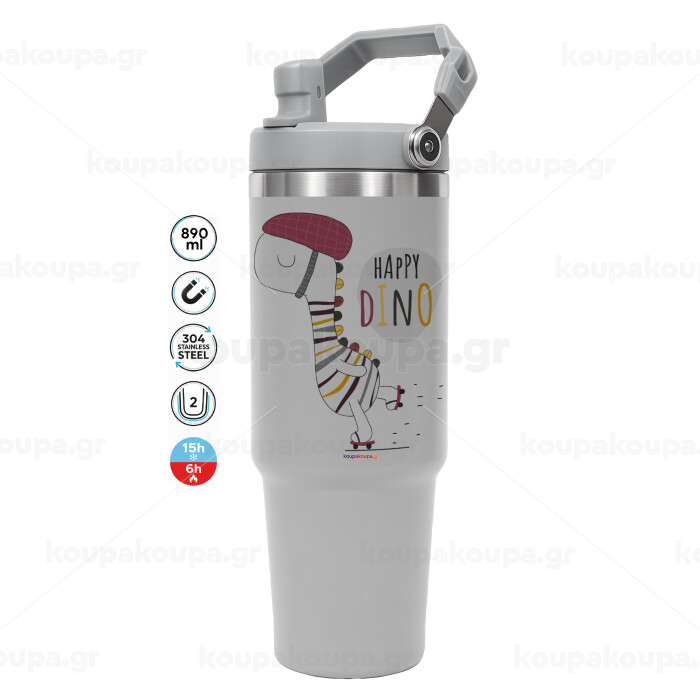 Happy Dino, GREY color, 890ml (30oz) stainless Steel Tumbler with Handle