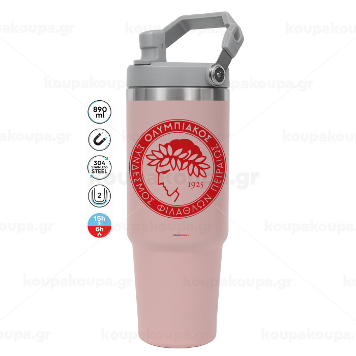 Ολυμπιακός, Pink color, 890ml (30oz) stainless Steel Tumbler with Handle