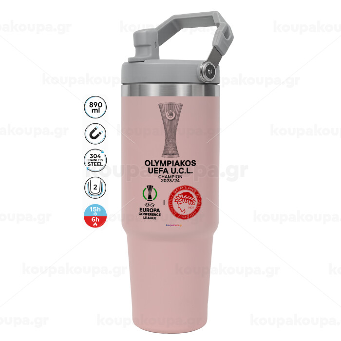 Olympiacos UEFA Europa Conference League Champion 2023/24, Pink color, 890ml (30oz) stainless Steel Tumbler with Handle