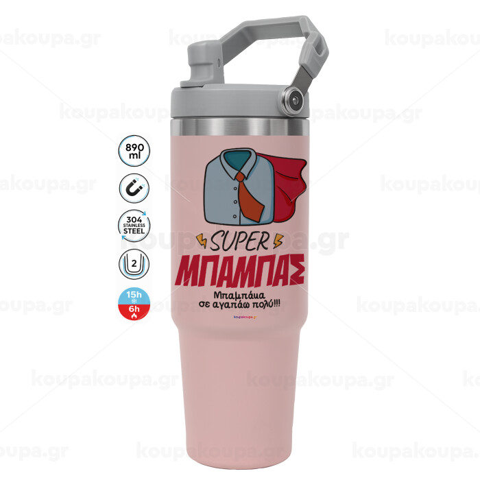 SUPER ΜΠΑΜΠΑΣ, Pink color, 890ml (30oz) stainless Steel Tumbler with Handle
