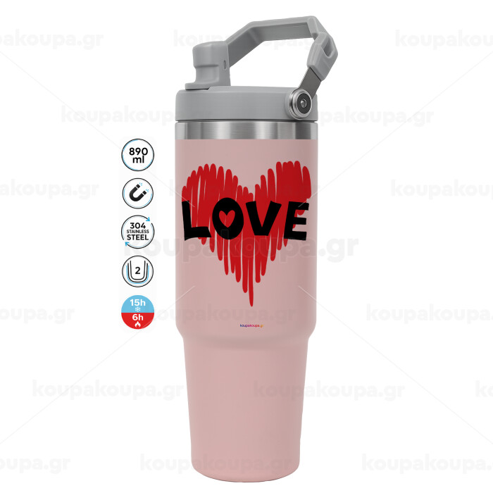 I Love You red heart, Pink color, 890ml (30oz) stainless Steel Tumbler with Handle