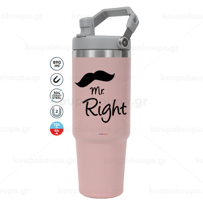 Mr right Mustache, Pink color, 890ml (30oz) stainless Steel Tumbler with Handle