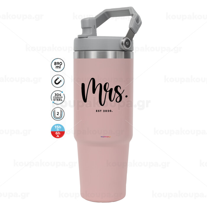 Mr & Mrs (Mrs), Pink color, 890ml (30oz) stainless Steel Tumbler with Handle