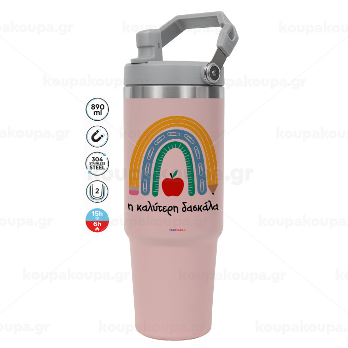 Η καλύτερη δασκάλα, Pink color, 890ml (30oz) stainless Steel Tumbler with Handle