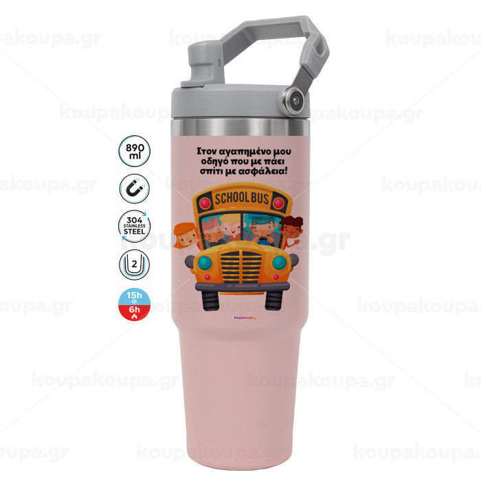 Στον αγαπημένο μου οδηγό που με πάει σπίτι με ασφάλεια!, Pink color, 890ml (30oz) stainless Steel Tumbler with Handle